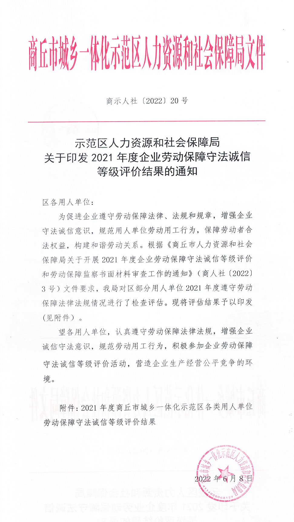 近日,商丘市示范區人力資源和社會保障局公布了《關于2021年度商丘市城鄉一體化示范區各類用人單位勞動保障守法誠信等級評價結果》,我公司再次被評為示范區勞動保障守法誠信A級示范單位,這一榮譽充分表明了勞動保障部門對公司勞動管理規范與員工權益保障等方面工作的充分肯定。